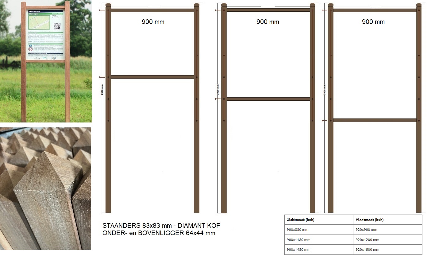 Een gestandaardiseerd buiten bewegwijzeringsysteem van duurzaam hardhout, FSC gekeurd Azobe hout. Staanders van 83x83 mm zijn stijlvol afgewerkt met een diamantkop. De opsluitprofielen zijn 64x44 mm en zijn net als de staanders voorzien van uitgefreesd sleuven waar men een maximaal 4 mm dikke dibond of bijvoorbeeld een chique acrylaat plaat in plaatst die men belettert of laat printen (paneel wordt niet meegeleverd). Het paneel valt rondom 1 cm in de staanders en de opsluitprofielen. De afmetingen van het frame zijn: lengte paal 2900 mm en breedte is van de boven- en onderligger zijn 900 mm (deze kan men eventueel zelf inkorten). Een set bestaat uit 2 palen en een boven - en een onderligger van 600 mm lang. De onderligger kan men op 3 verschillende hoogtes aan de staanders gemonteerd worden. Daarvoor zijn in de staanders op 4 plaatsen schroefgaten voorgeboord. De staanders en liggers zijn uitgefreesd en voorgeboord en voorzien van de benodigde schroeven en grondankers. Zie voor de standaard afmetingen die men kan realiseren de bijgevoegde afbeelding. Levering met een enkelzijdig geprint 3 mm dik dibond paneel met beschermende coating (keuze uit mat of glans coating). Dubblezijdig geprint paneel daarvoor is prijs op aanvraag. Drukklaar bestand aanleverenop basis van de gewenste afmeting met rondom 1 cm afloop en hierbij rekening houden met de aangegeven zichtmaat zoals in de afbeelding vermeld.