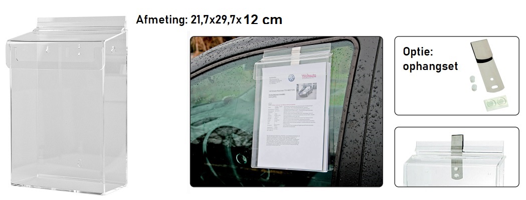 Praktische transparante spatwaterdichte display voor opbergen van folders/flyers A4 formaat met een eenvoudige opening. Extra diep: 12 cm. Optie een extra hangset voor bijvoorbeeld toepasssing bij autoverkoop; zie afbeelding.